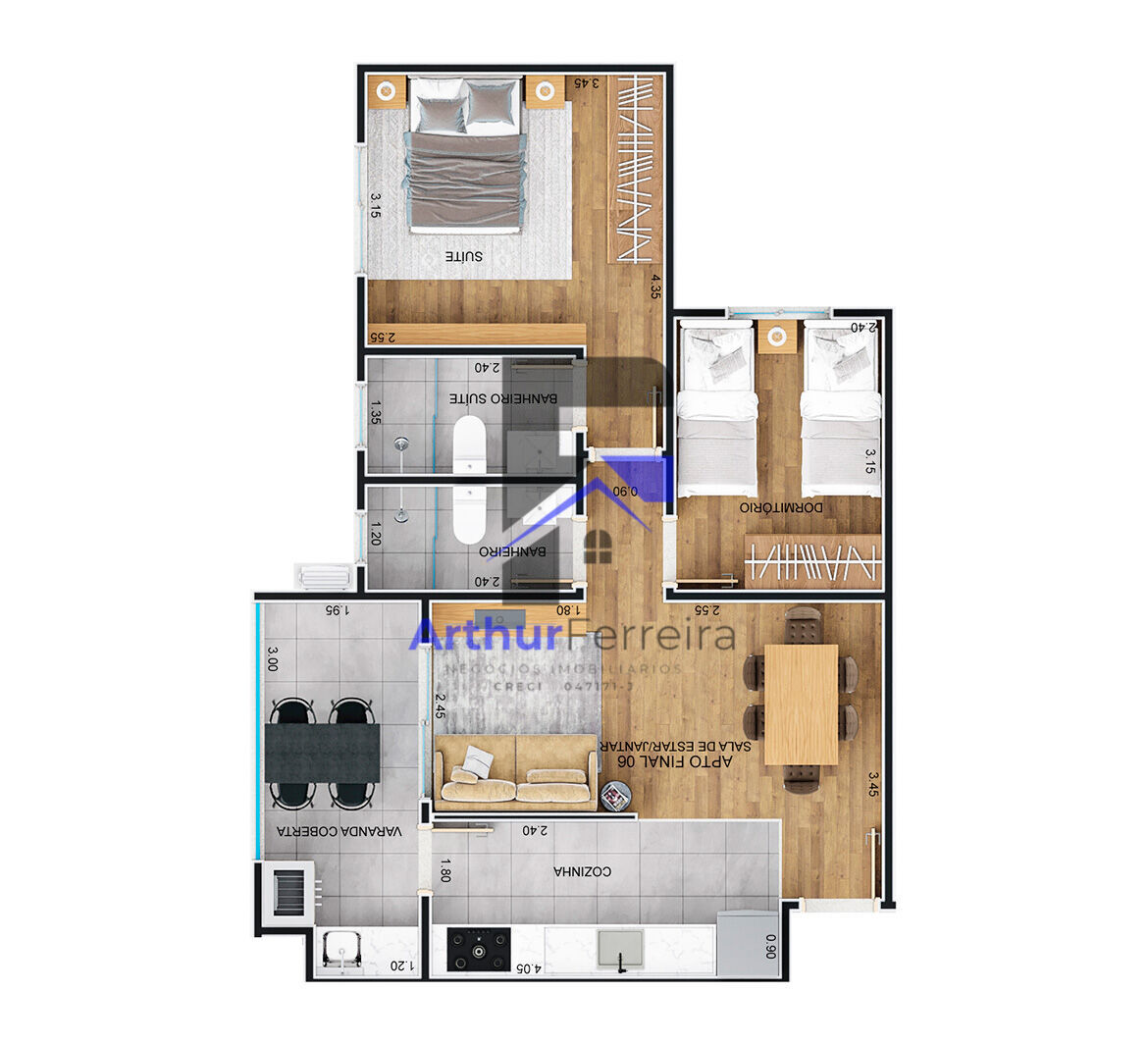 Área dos apartamentos: 64,64m² a 81,35m²